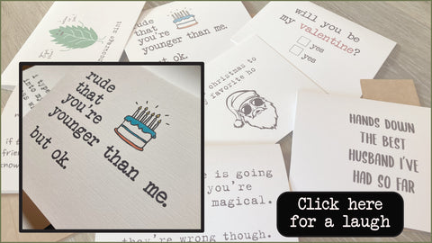 Hi! My name is Jackie and growing up, i was lucky to have my granny live with us, and boy did she have a great sense of humor! I started this card company several years ago on Etsy in hopes of making people laugh like she did. Back in the day, people would send cards all of the time - i'd like to bring that back.